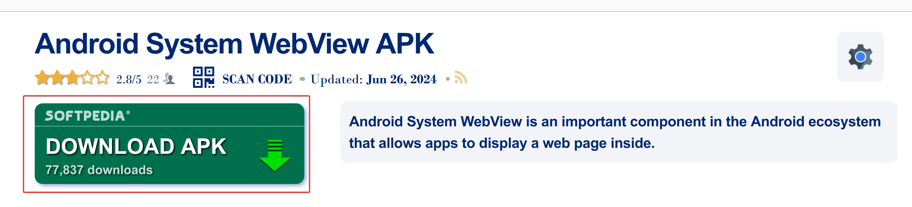 安卓手机请更新系统webview(一般通过应用商店或系统更新),也可下载apk更新如下: 请打开下载地址 点击download apk > Android System WebView xxx 下载apk安装即可